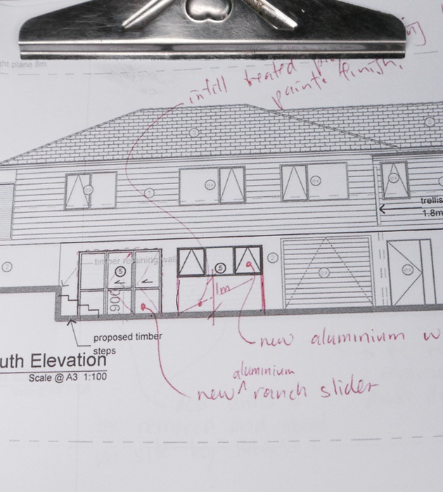 Architectural plans with notes for the removal and acquisition of garage doors from Mahia Road, Manurewa